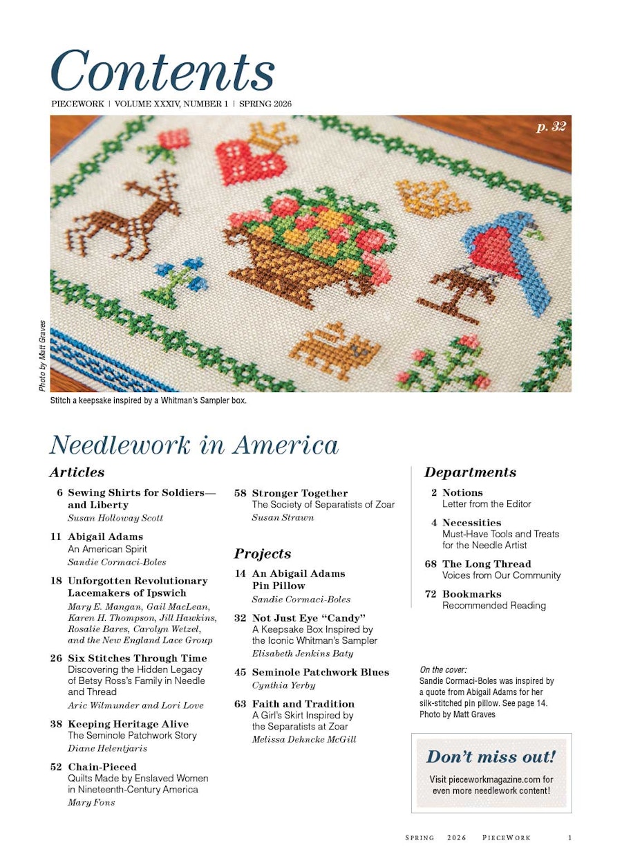 Inspired by the 250th anniversary of the Declaration of Independence, we’ve devoted this issue to honoring American Needlework. From lacemakers and handsewn shirts for Revolutionary War soldiers to immigrant knitting traditions and quilts of the enslaved, these stories stitch together two and a half centuries of creativity, resilience, and identity.