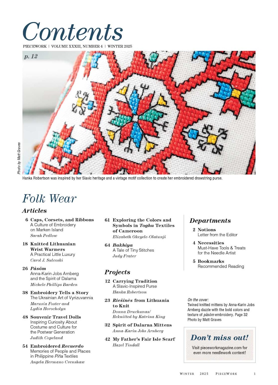 In this issue, we journey across a dozen borders and multiple generations to explore the beauty of global folk wear. From embroidered garments rich with symbolism to textiles that tell stories of place, people, and ceremony, each piece reflects the artistry of needlework traditions. Discover patterns, histories, and endless inspiration from around the world and see how folk dress continues to shape culture today.