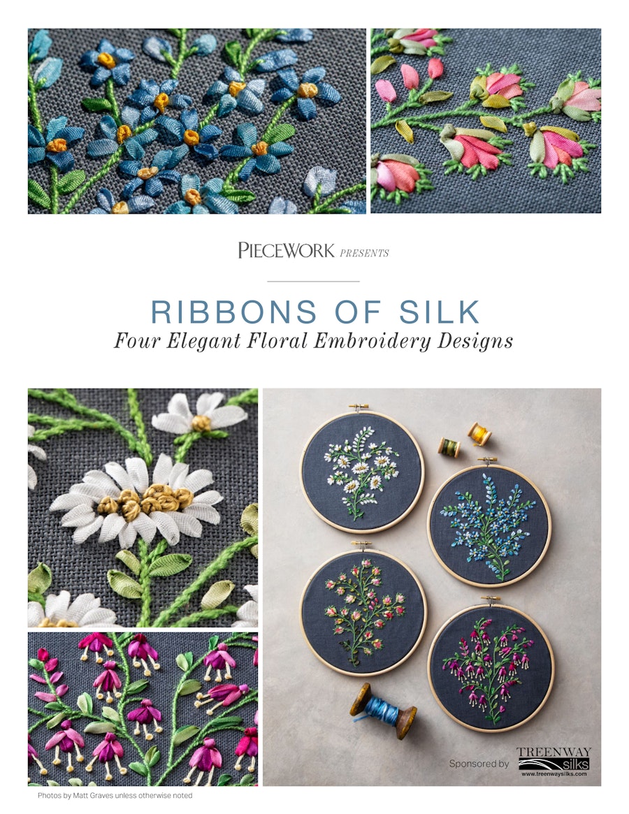These beautiful designs were published over a year’s worth of PieceWork magazine issues, but now you can get them all in one place. Enjoy exploring silk-ribbon embroidery and bringing texture and dimension into your home with this special collection.
