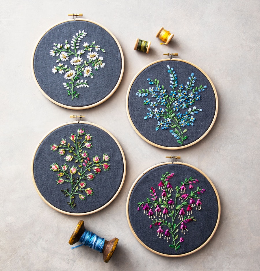 These four silk-ribbon embroidery designs are inspired by a Victorian-era cape in the Metropolitan Museum of Art. Embroidery artist Deanna Hall West selected four flowers from the original piece—marguerite daisies, forget-me-nots, rosebuds, and fuchsias—and created a design for each, complete with bonus insights on the language of flowers.