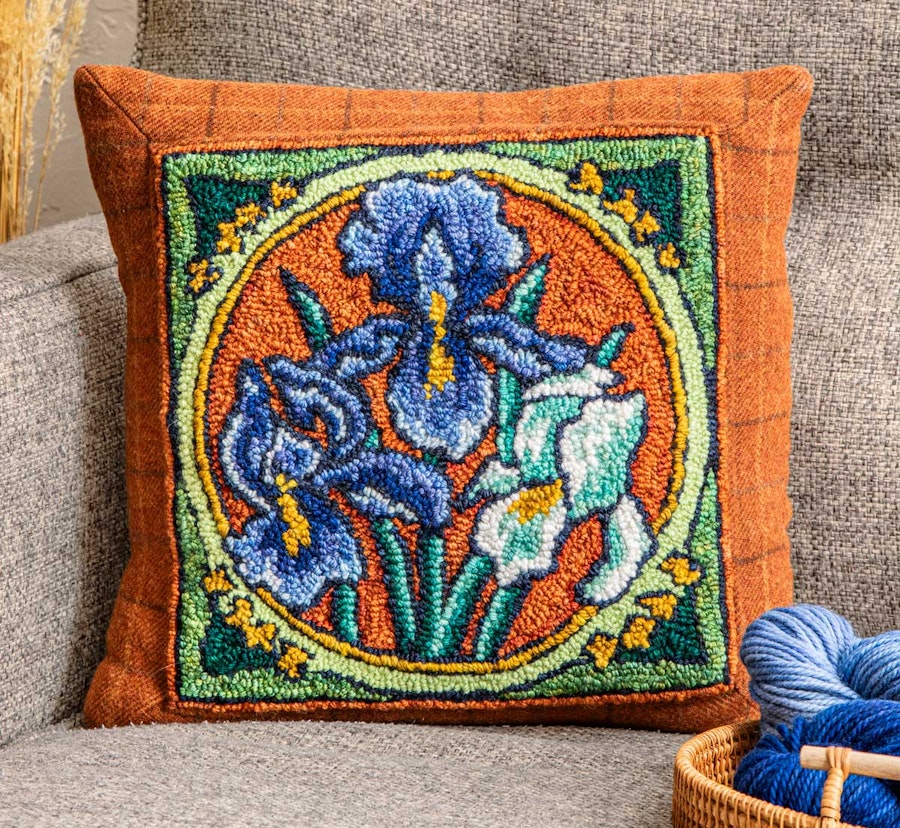 The versatility of punch needle embroidery allows yarns to function like paints, with finished artworks easily incorporated into functional items. In this case, the little punched rug was transformed into a pillow, inviting viewers to experience the irises in a tactile way. The design was framed with wide wool fabric strips added before the punching began, making the final assembly of the pillow both quick and straightforward.