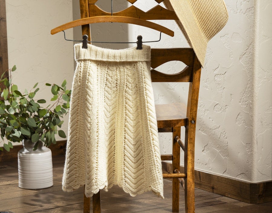This girl’s skirt pattern is based on an original piece preserved in the Ohio History Connection’s collection from the historic Zoar Separatist community. The original white wool skirt—likely an underskirt—was handknitted sometime between 1804 and 1859. In re-creating it, I chose to knit the front and back separately and then seam them together since circular needles were not yet in use when the original was made. The pattern, however, can easily be adapted for circular knitting. It took some experimentation to replicate the chevron welt pattern accurately. While the original skirt is finished with a linen waistband, I opted for a simple knitted rib that can be worn either straight or folded over. —Melissa Dehncke McGill