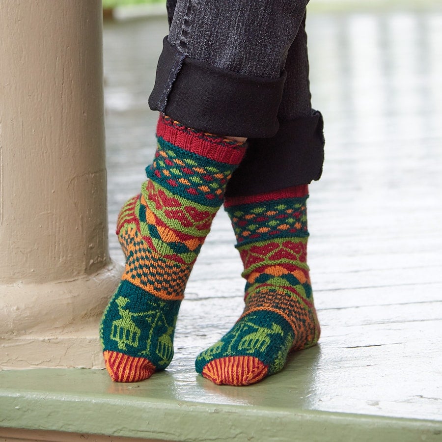 Yarn: Cascade Yarns Heritage, 75% superwash merino wool/25% nylon yarn, fingering weight, 437 yards (399.6 m)/100 gram (3.5 oz) skein, 1 skein each of #5657 Hunter Green (MC), #5607 Red (CC1), #5659 Primavera (CC2), and #5641 Mango (CC3).