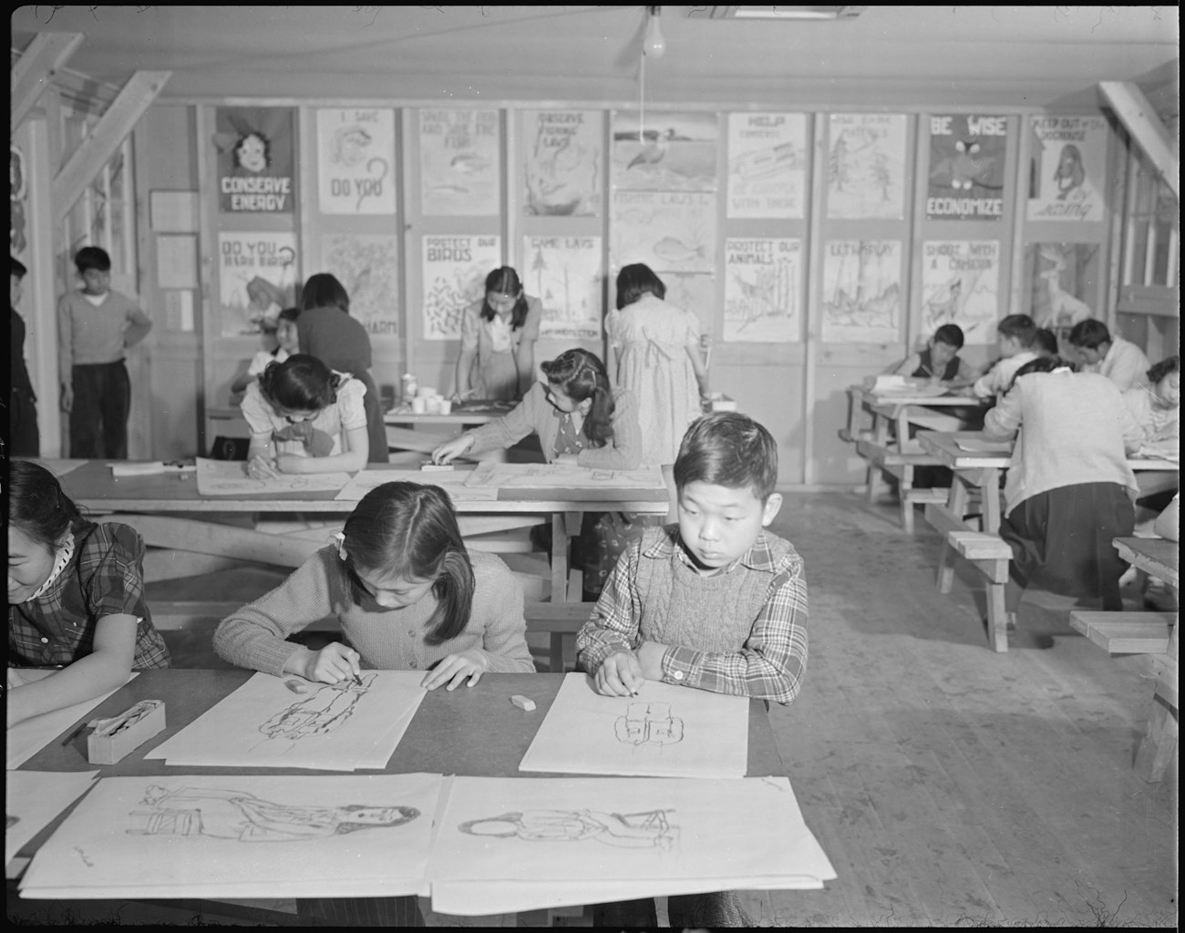 Children at a hand drawing class at the Minidoka Relacation Center, 1942. Photo courtesy of National Archives and Records Administration