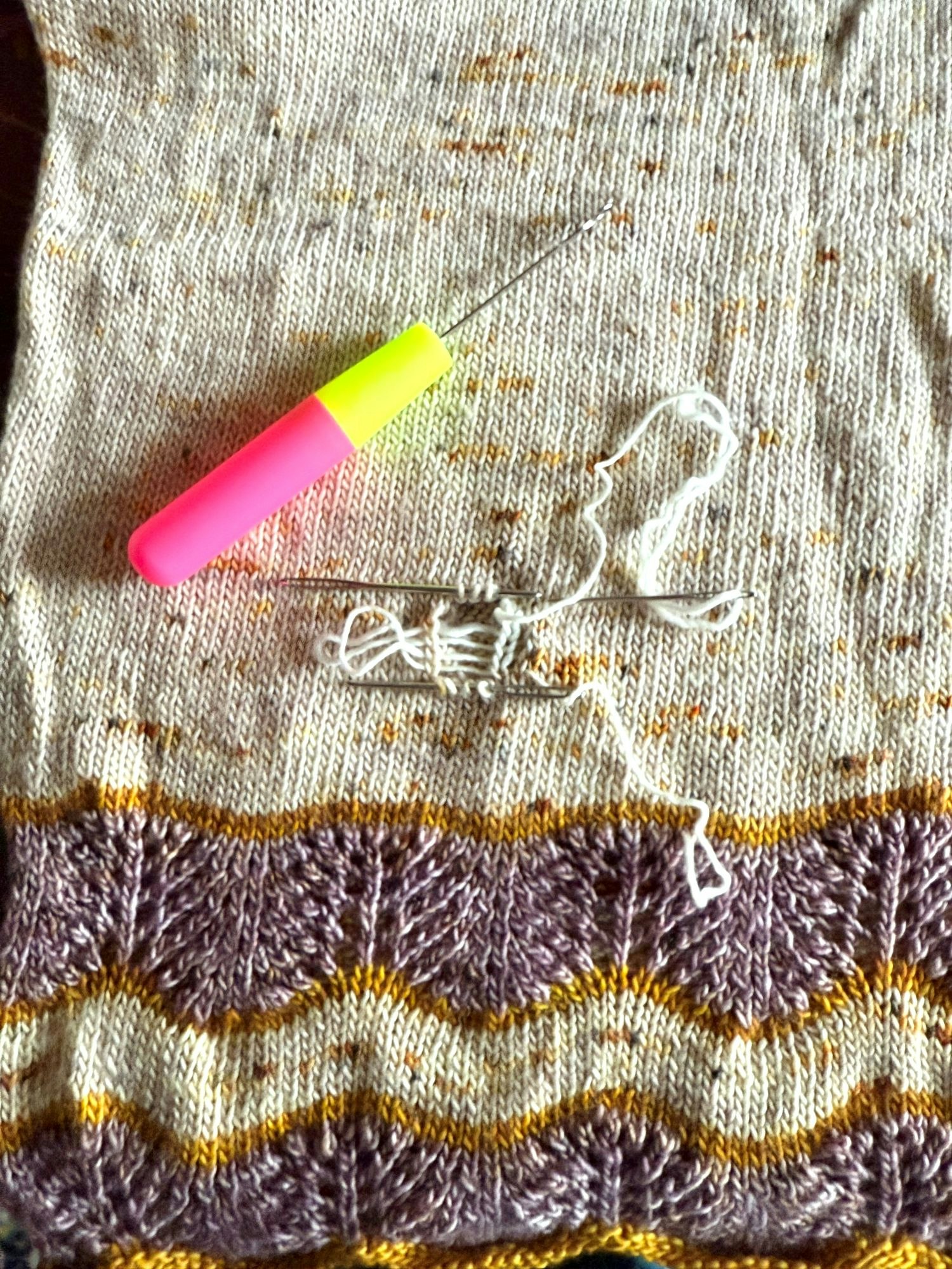 In January of 2022, just as I thought some normalcy might be returning after the pandemic, I had a fire in my home that displaced my family for 15 months. I put dozens of my handknitted sweaters and shawls into storage, and when I moved back home and unpacked the boxes I found they were terribly moth-eaten. Overwhelmed by the enormity of the loss, I could not imagine fixing them. Many seemed beyond repair. I threw a few of the most damaged ones out in my initial despair, salvaging buttons or a sleeves-worth of yarn when possible. I had never mended knitted garments before, and amid the stress of moving and writing a book, I could not take on learning how. I washed them all, sorrowfully watching the garments disintegrate further in the water, and put them in airtight storage bags in a closet. For nearly two years I avoided dealing with the damage—I just couldn’t face it. But I missed my handknits. They form a substantial part of my wardrobe and are an expression of myself, reflecting the work of my mind and my hands.