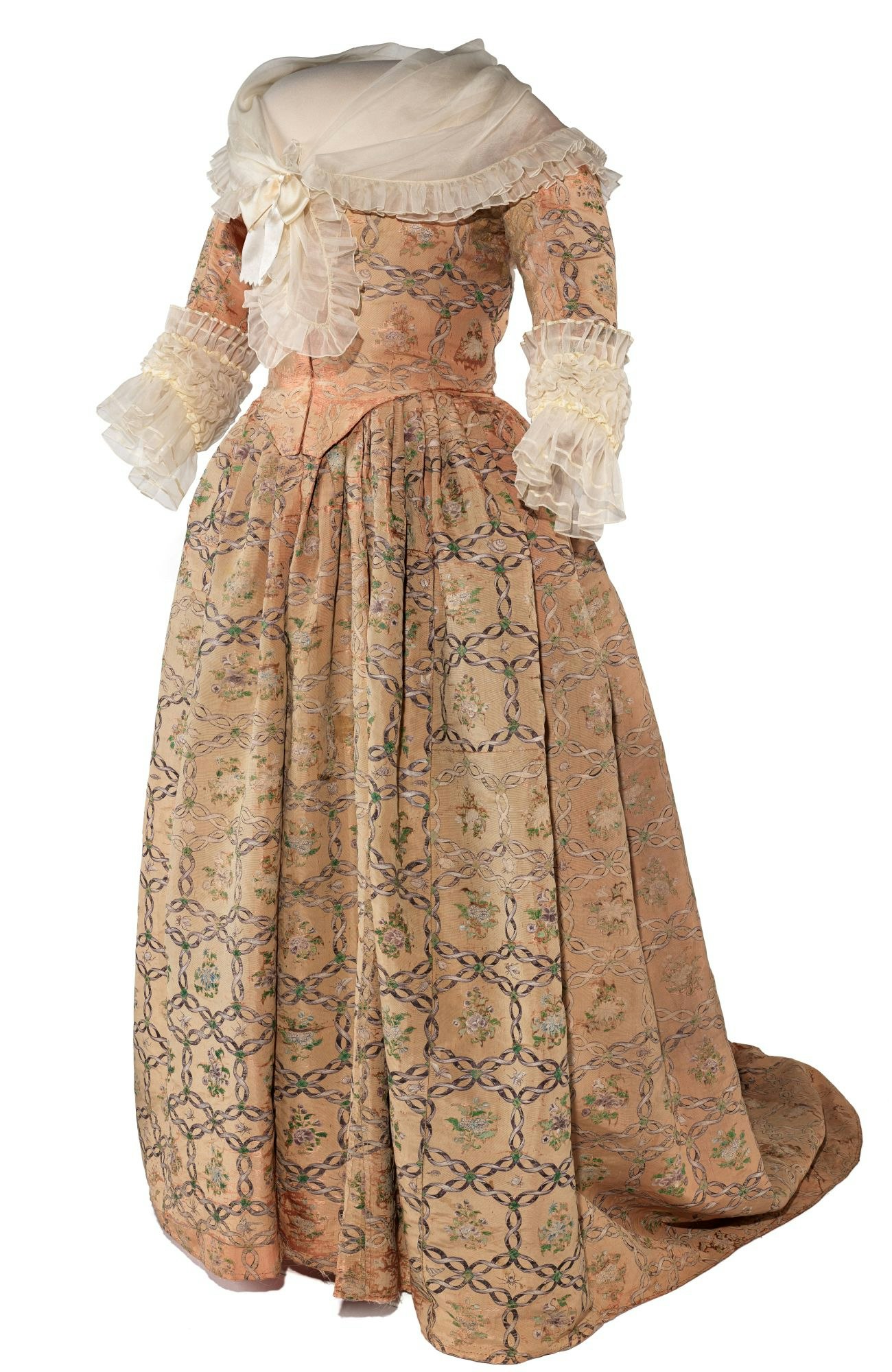 A Silk dress worn by Martha Washington. The gown's basic style is typical of the early 1780s. The painted pattern on the silk taffeta is a repeat of four floral bouquets and 58 different creatures within the spaces between the ribbon-trellis pattern. The collar and cuffs are reproductions. Gift of Mrs. John McFarland Bergland and Mrs. Asher Abbott White, courtesy of the Smithsonian, American History Museum