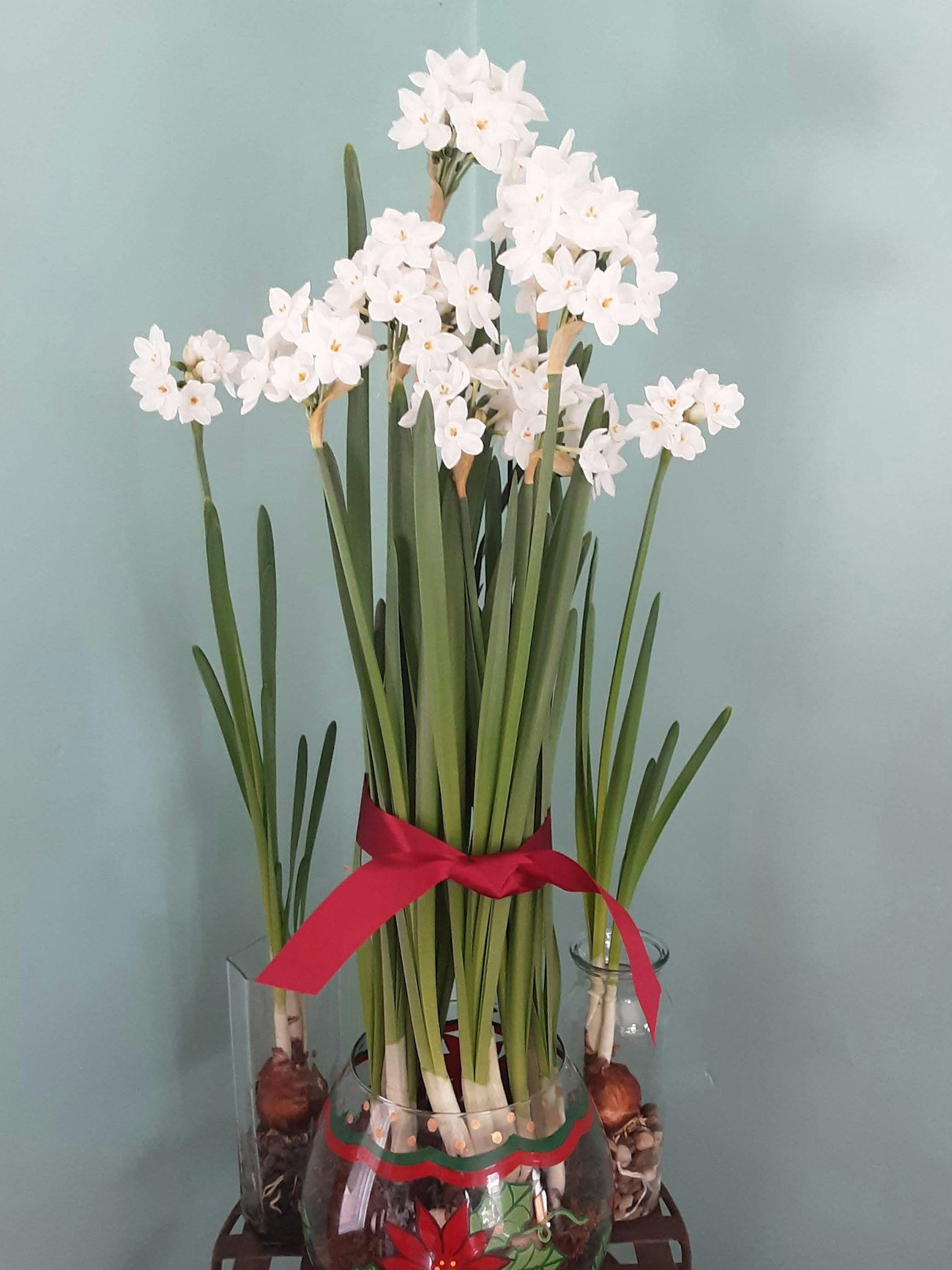 Every December, my friend gives me a tall glass vase with paperwhite bulbs nestled on a bed of stones, their bases just touching the water. They’re not especially attractive early on, but soon those turnip-like clumps begin to sprout green tendrils. Then in winter sunshine, their stalks grow a shocking amount each day. When the stalks are well over a foot high, a few buds emerge, and within another week or so, the most fragrant white blossoms tower over the top of the vase. These paperwhites are such a burst of joy in the dark days of winter, and I understand why they’re sometimes called “winter’s surprise.” The blossoms usually last through January, but by February I have to say goodbye until the next winter, when my friend arrives with a fresh vase of bulbs.