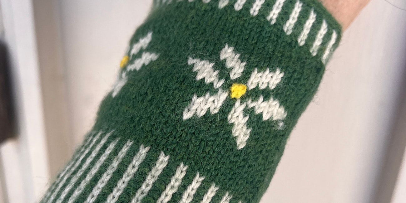 These simple colorwork cuffs feature a corrugated rib at top and bottom and a repeating six-petaled blossom, with a French knot at the center. I chose green knowing it would be March before I finished knitting the cuffs, and green and white felt like perfect colors.