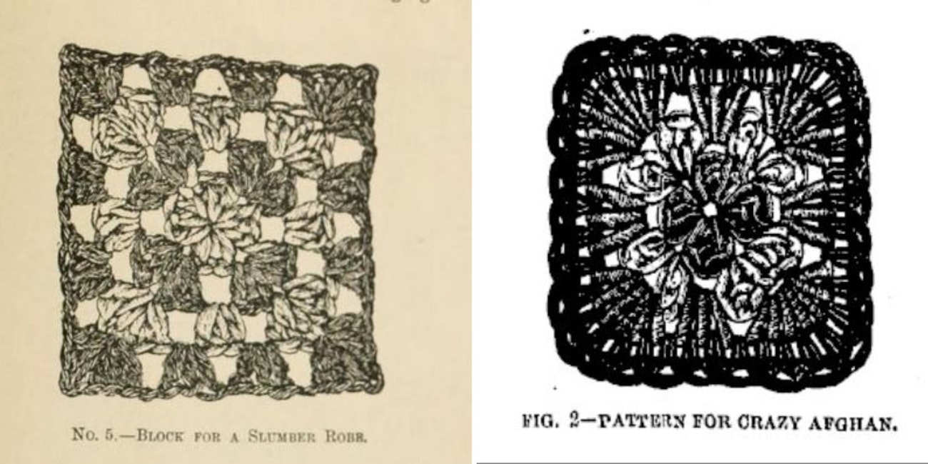 Left: Granny square engraving from The Art of Crocheting, a book on crocheting published in 1891. Right: Granny square design from the April 4, 1885 issue of Prairie Farmer Magazine
