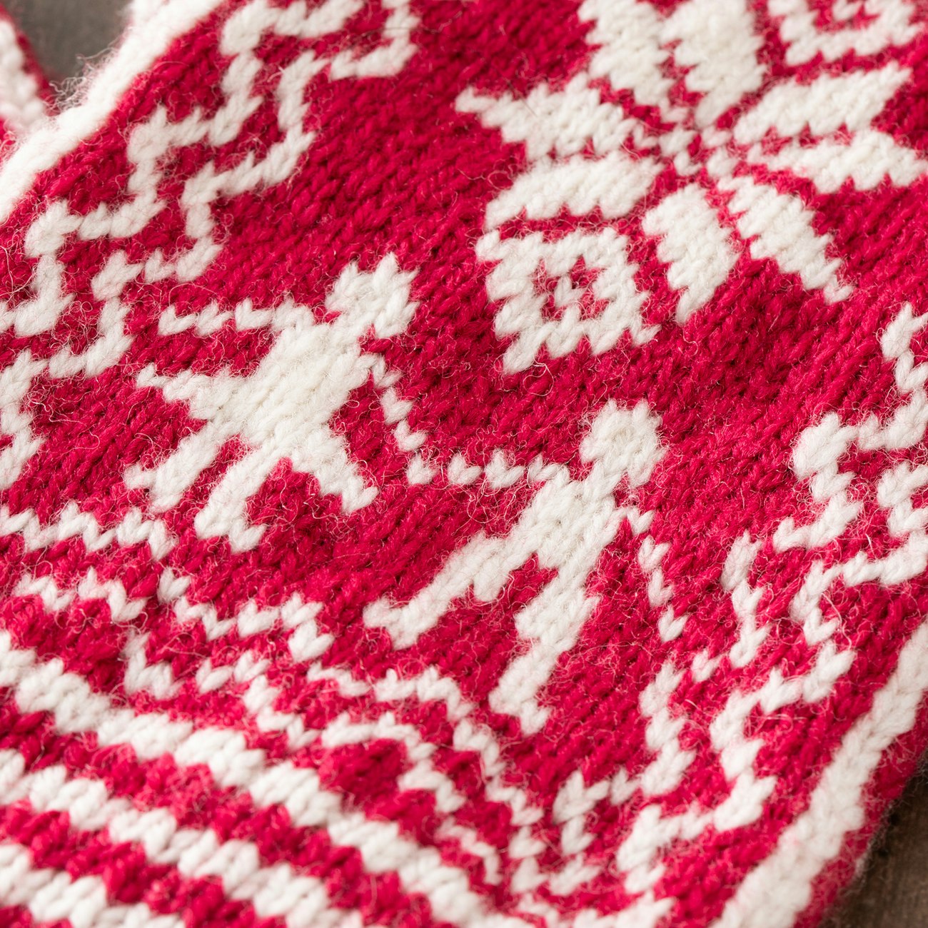 In one popular traditional Selbu mitten design, the main pattern on the mitten front incorporated two repeats of the selburose, an eight-petal rose motif. The mitten palm was traditionally knitted in a small, repeating pattern that enhanced the mittens’ durability. Selbu mittens were usually knitted in black and white wool, with black patterning on a white background, although other colors were sometimes used. Stranded knitting produces a warmer, more weather-resistant hand covering.