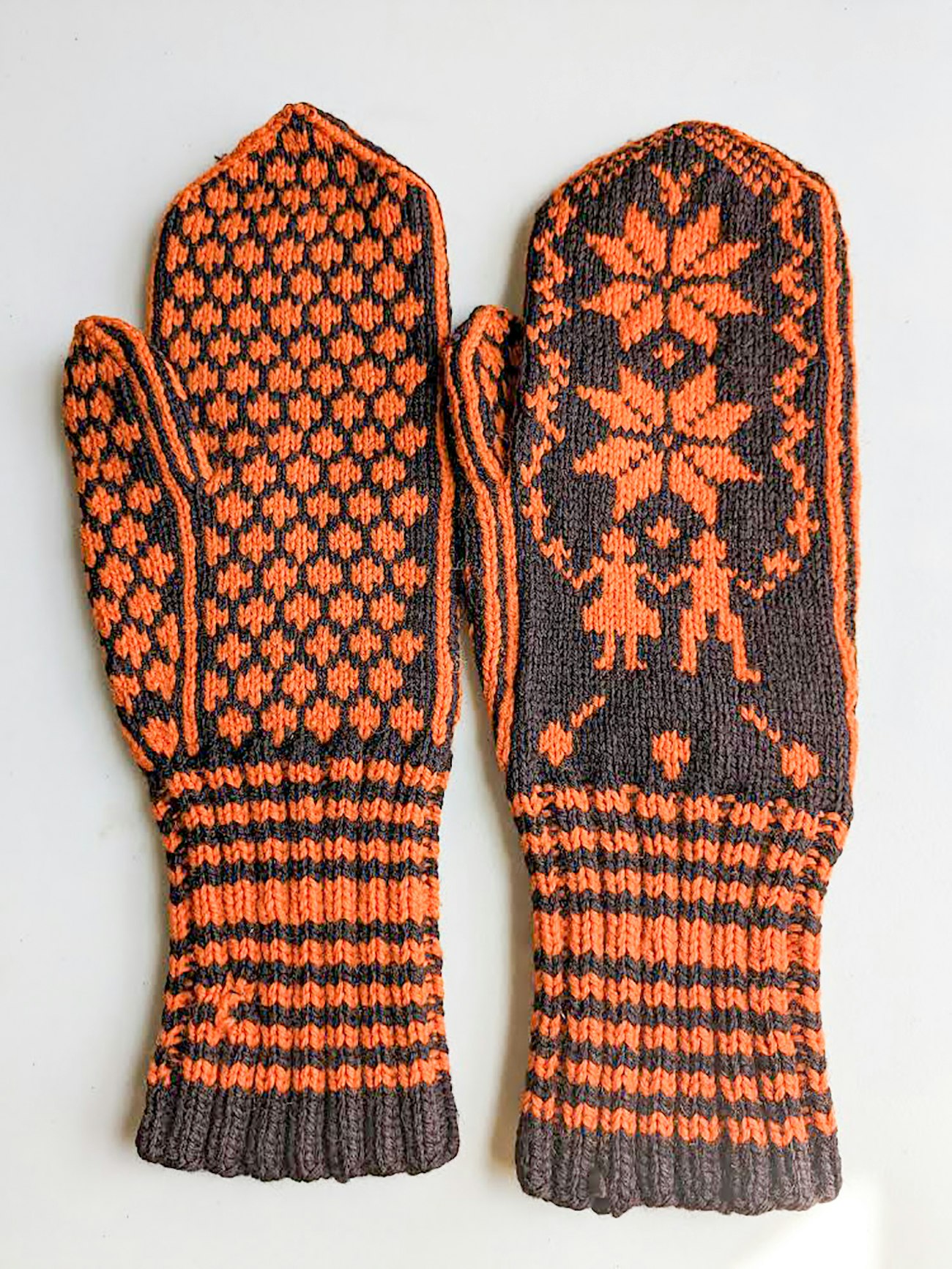 Ruby knitted the mittens now in Vesterheim’s collection for her nephew Austin T. Helgerson (1917–2003), a lifetime member of Vesterheim. When Austin donated the mittens to Vesterheim, he advised the museum that Ruby had knitted the mittens in 1938. Although Selbu mittens are traditionally knitted in black and white wool, Ruby elected to knit Austin’s mittens in orange and black wool, the colors of Austin’s high school in Red Oak, Iowa.