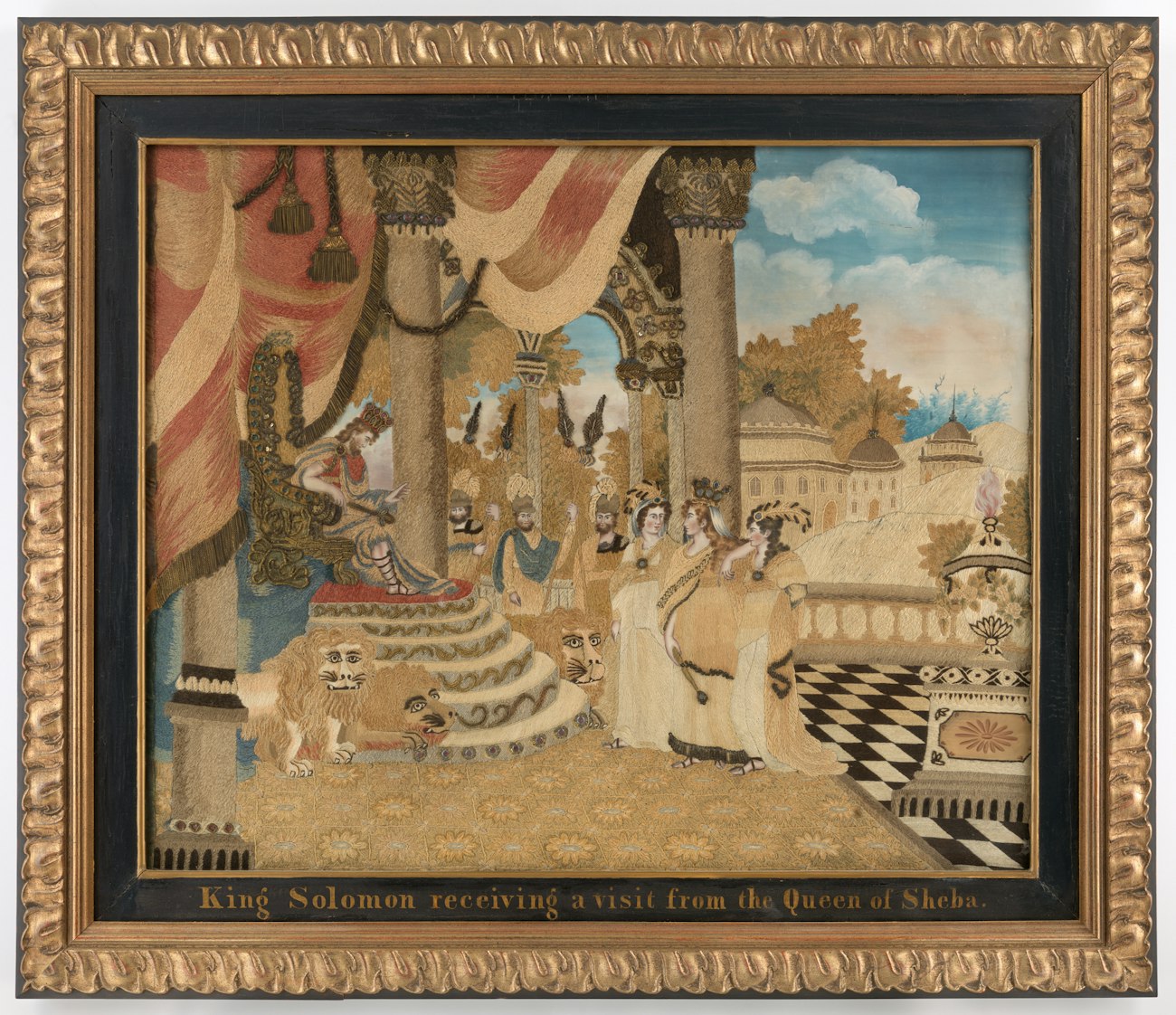 A large pictorial embroidery, expensively framed, for example, proclaimed the skill of its maker, the ability of her parents to send her to school (where she could spend time on ornamental sewing) and do without her help at home, and their pride in her accomplishments. Perhaps the subject matter of the Queen of Sheba holding her own against the famously wise King Solomon was a subtle statement celebrating women’s education, which was gradually becoming more widespread—and the curriculum, more academic—at this time.