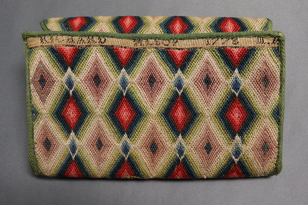 Pocketbook, gift of Mary Wright Alsop of Connecticut to her husband Richard, 1773. The Daughters of the American Revolution Museum 961, gift of Julia Rogers