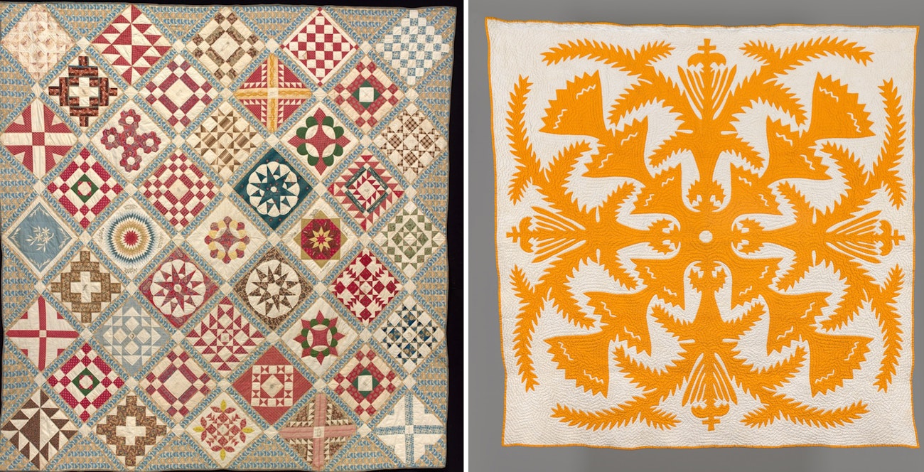 Left: Sykes family album quilt, 1847, Burlington County, New Jersey. The Daughters of the American Revolution Museum 94.23, gift of Dorothy Truitt. Right: “Comb of Kaiulani,” quilt by unknown maker, Hawaii, 1920s. The Daughters of the American Revolution Museum, 2023.6