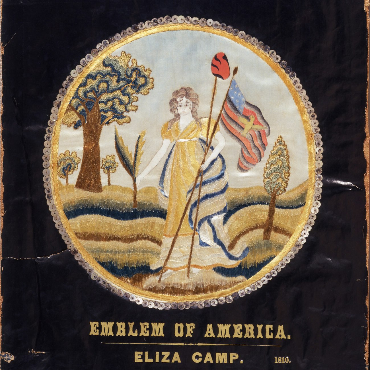 Silk-on-silk embroidery with spangles by Elizabeth Meyers of Philadelphia, 1818, with painted background and figures by Godfrey Folwell. The Daughters of the American Revolution Museum 961,2020.13, gift of Kathryn Reeves-Hoche