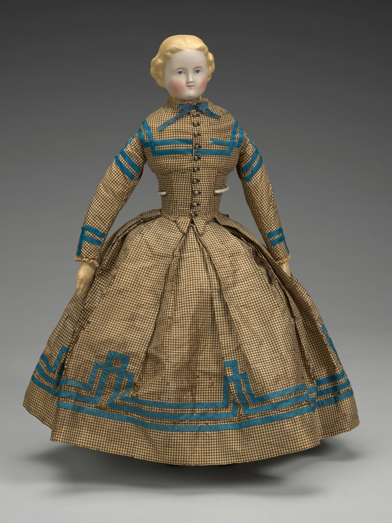 This doll was won at a charity fair in about 1860 in Massachusetts. Dolls for sale for raffle, often with full wardrobes, were popular offerings at such fairs. The Daughters of the American Revolution Museum 4119, gift of Alice Staples Lane