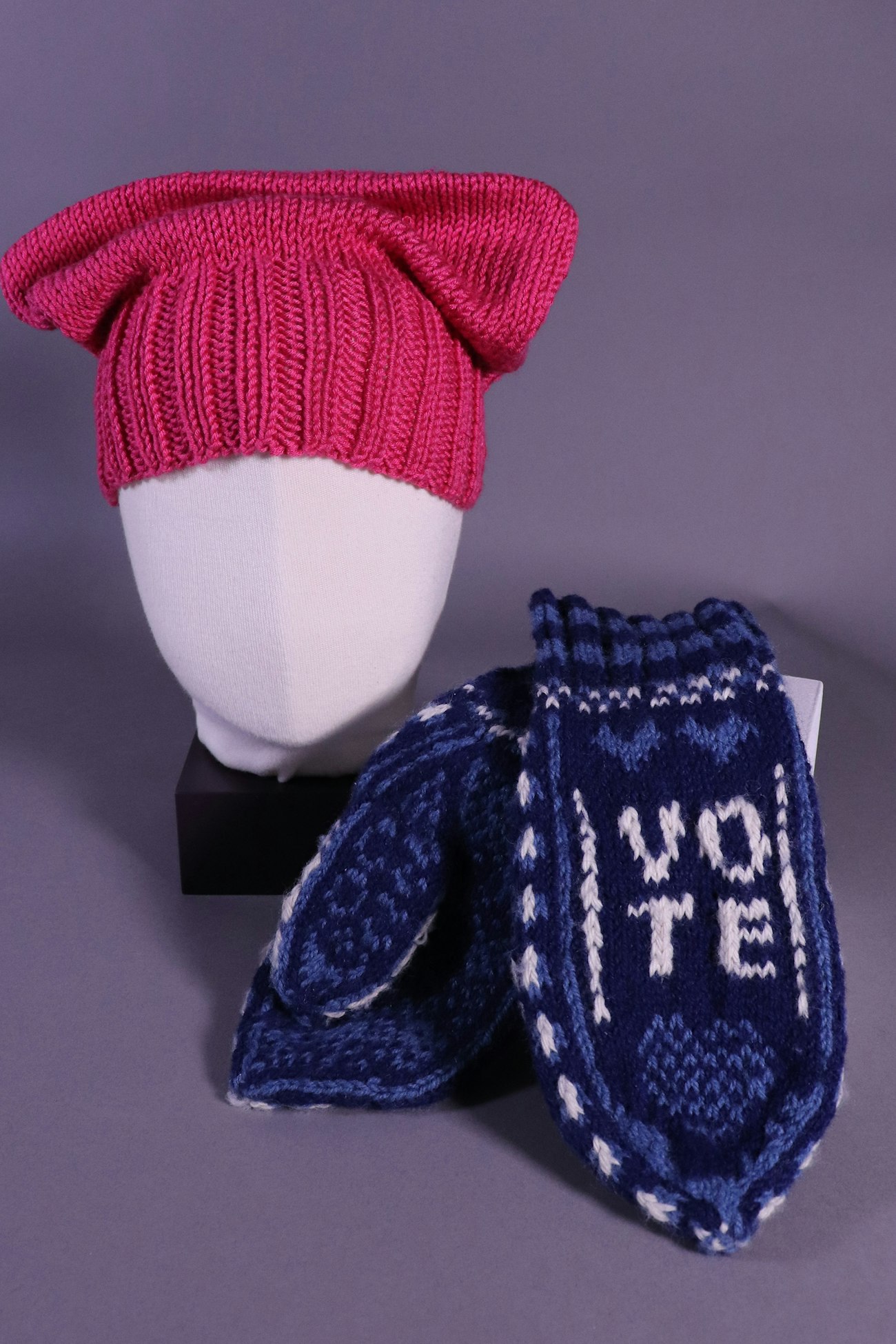 “Pussy hat” worn at the 2017 Women’s March in Washington, DC, and mittens, worn at Black Lives Matter and other marches in Minnesota. Hat made by Stephanie Szurek, worn and lent by Sarah Krispel. Mittens made and lent by Jennifer O’Brien