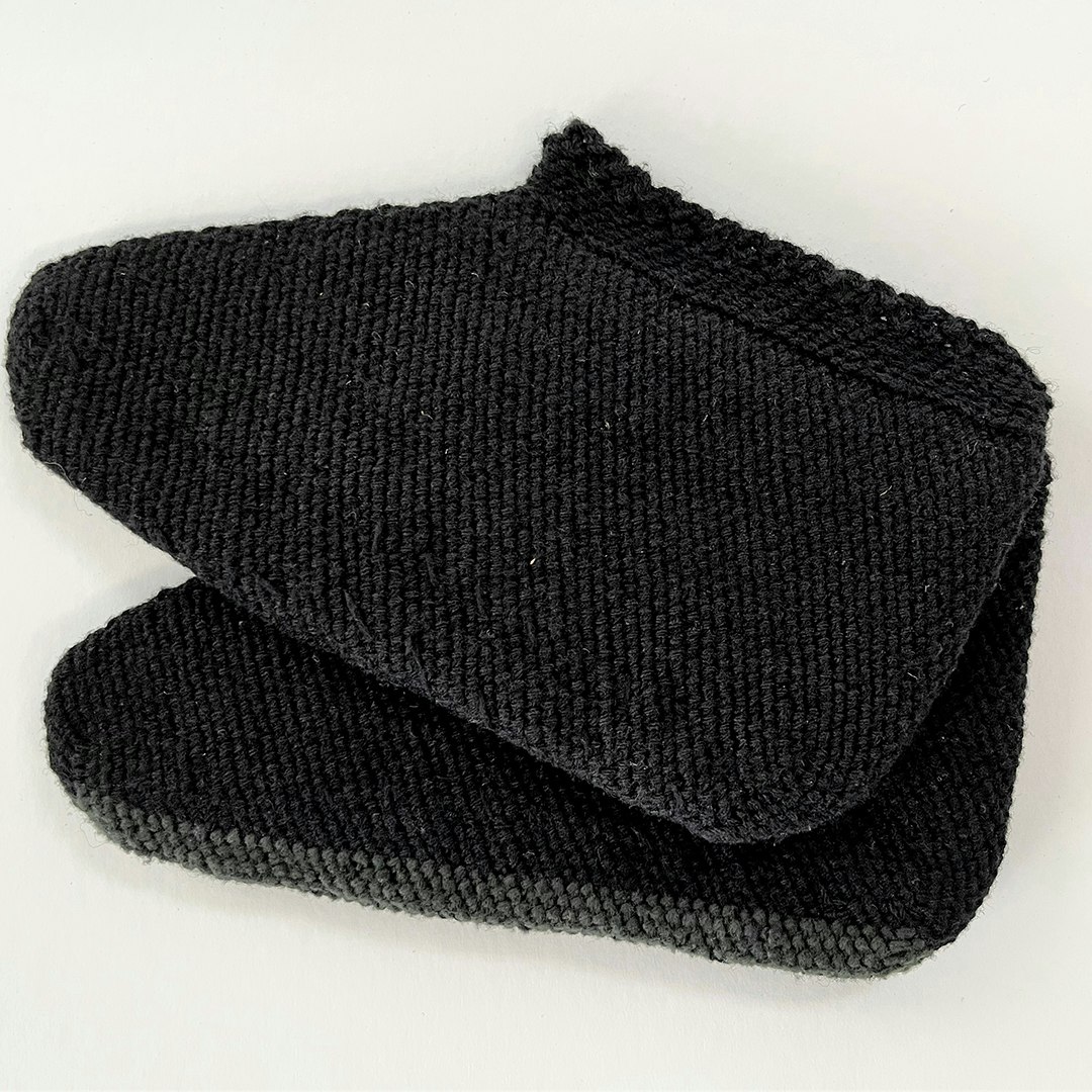 Slippers worked in a traditional pattern with increases and decreases along the outer edges only. One slipper has a dark gray bottom that would not show when