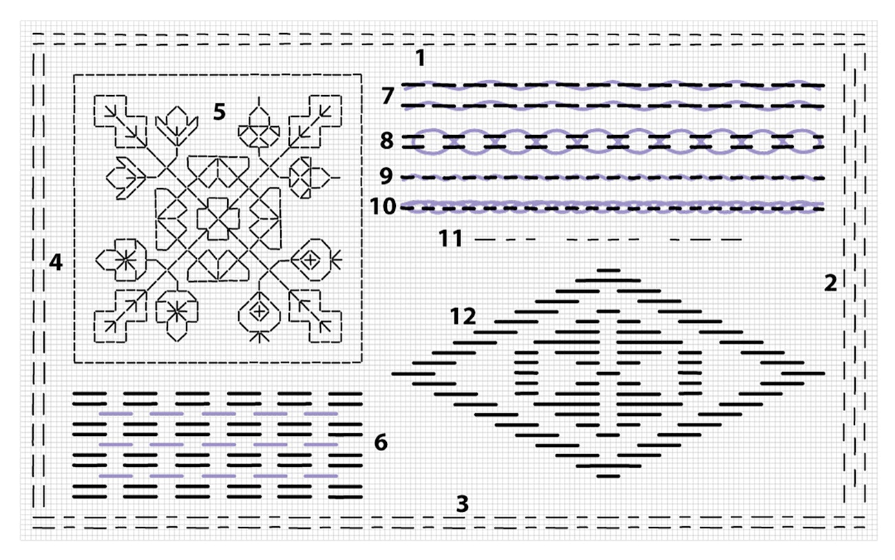Some of the many running stitch variations include double or Holbein (Figure 4), threaded or laced (Figure 5), double threaded (Figure 6), whipped or cordonnet (Figure 7), looped (Figure 8), and pattern darning (Figure 9) to name a few.
