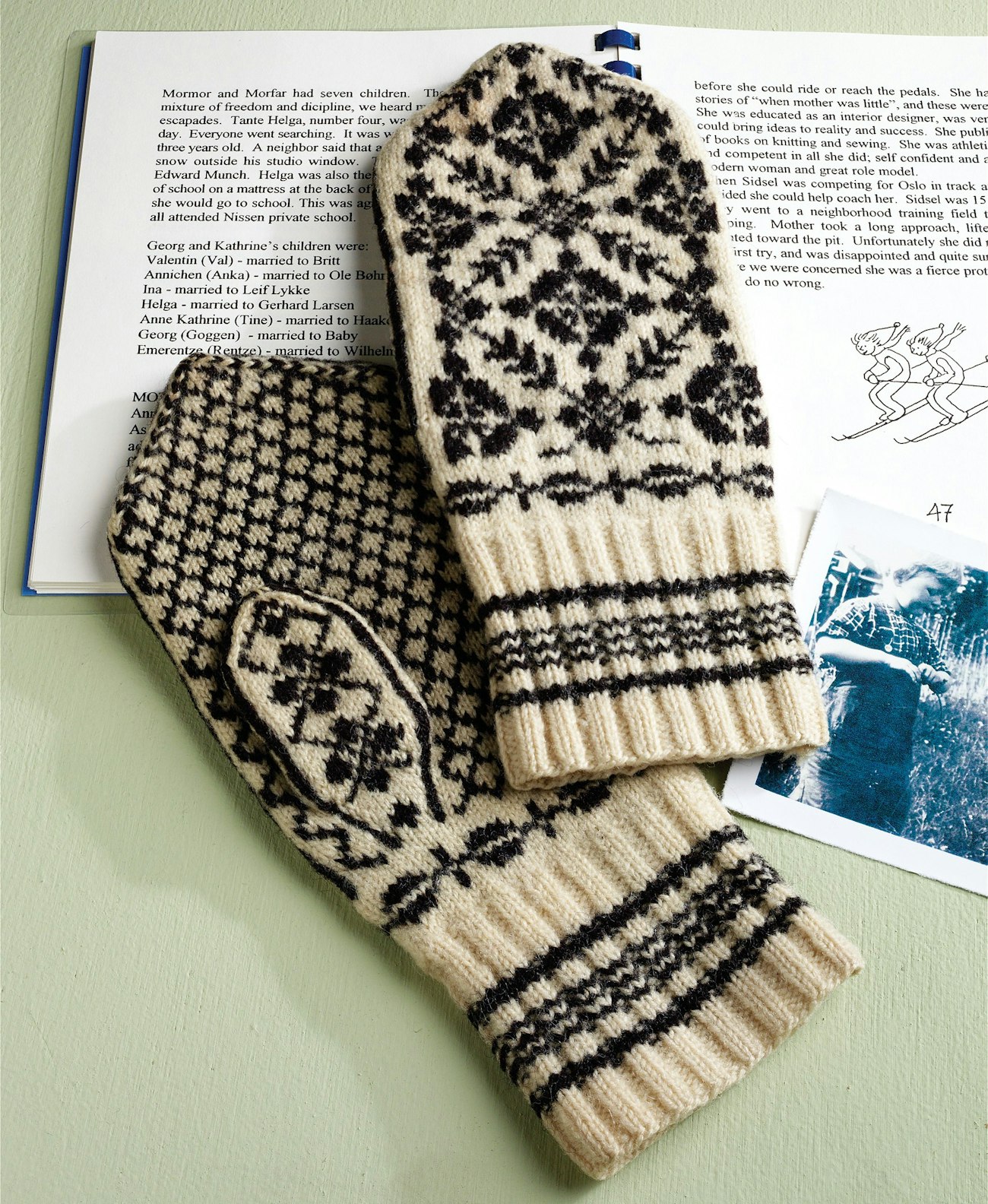 Traditional Selbu-patterned knitted wool mittens and a memory book that Annichen Sibbern Bøhn’s daughters, Lillan and Sidsel, created for their grandchildren with text (in English and Norwegian) about their lives and many family photographs, including photographs of Annichen. Mittens courtesy of the author; book courtesy of Lillan Kassel. Photograph by Joe Coca