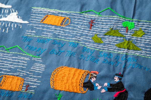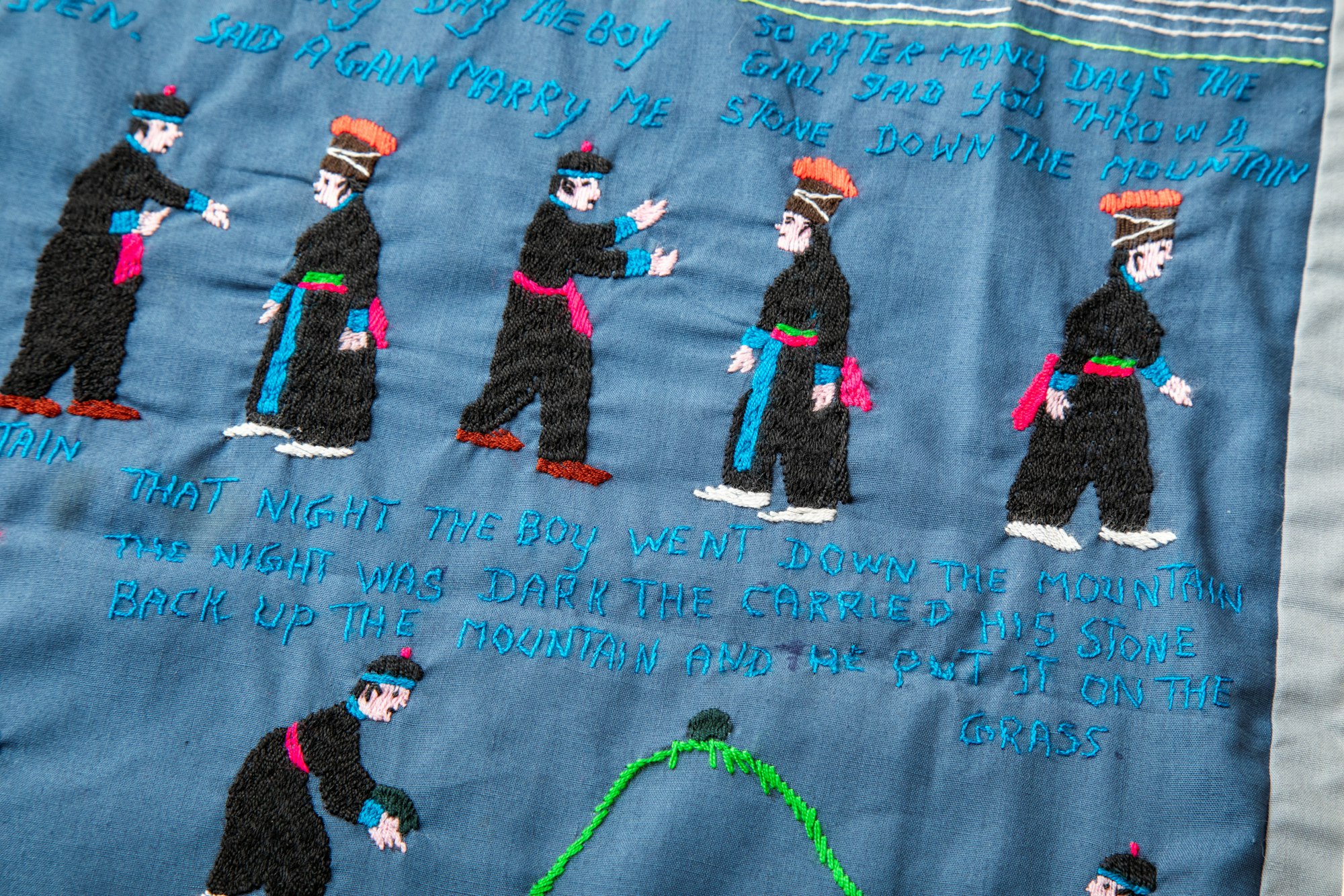 My cloth’s story is narrated in English words stitched under embroidered pictures. It seems to be a version of a Hmong creation tale that depicts a brother and sister who survived a devastating flood by floating in a large drum. When the waters receded and they emerged from the drum, they found that all other life had disappeared. As they grew older, the brother believed they needed to marry so they could create more people, but the sister refused. They sought guidance from a spiritual figure who told them to each roll a stone down a hill; if the stones landed together, the marriage should go forward. Somehow this miraculously happened, and with the girl’s acceptance of the proposal, a whole village flourished, and families suddenly had houses and livestock. The presence of English suggests that while my story cloth may have been started in Thailand, it was likely finished after Hmong resettlement here in the United States—perhaps even in Providence, which is only a few hours’ drive from the estate sale where I found it.
