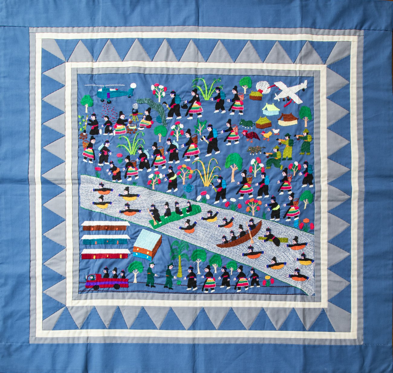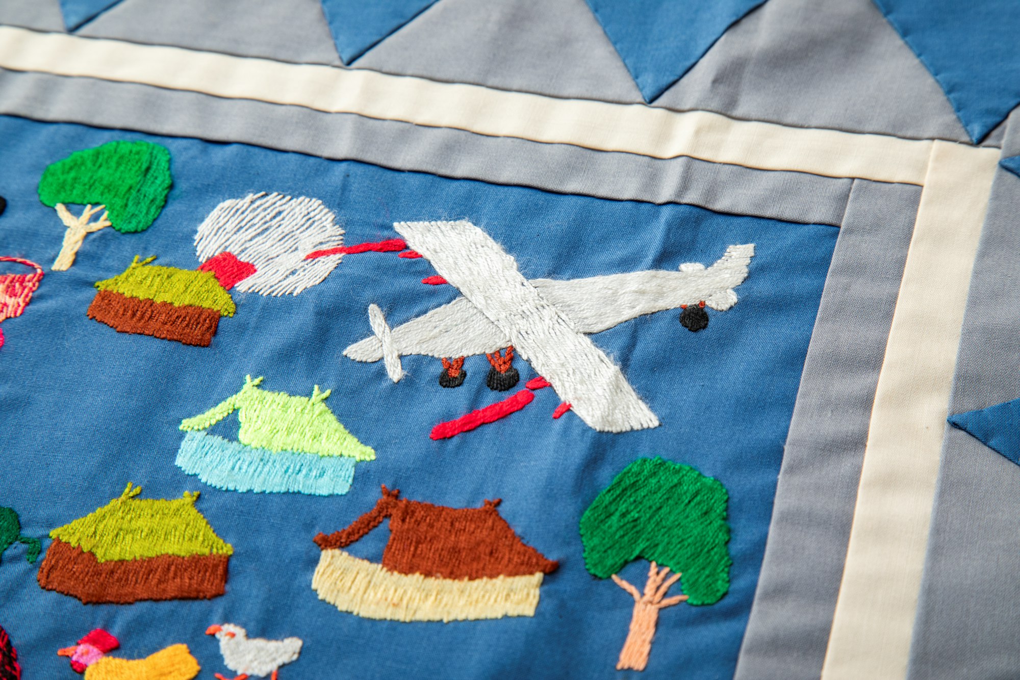 A helicopter attacking a Hmong village depicted on Joyce Walsh's story cloth.