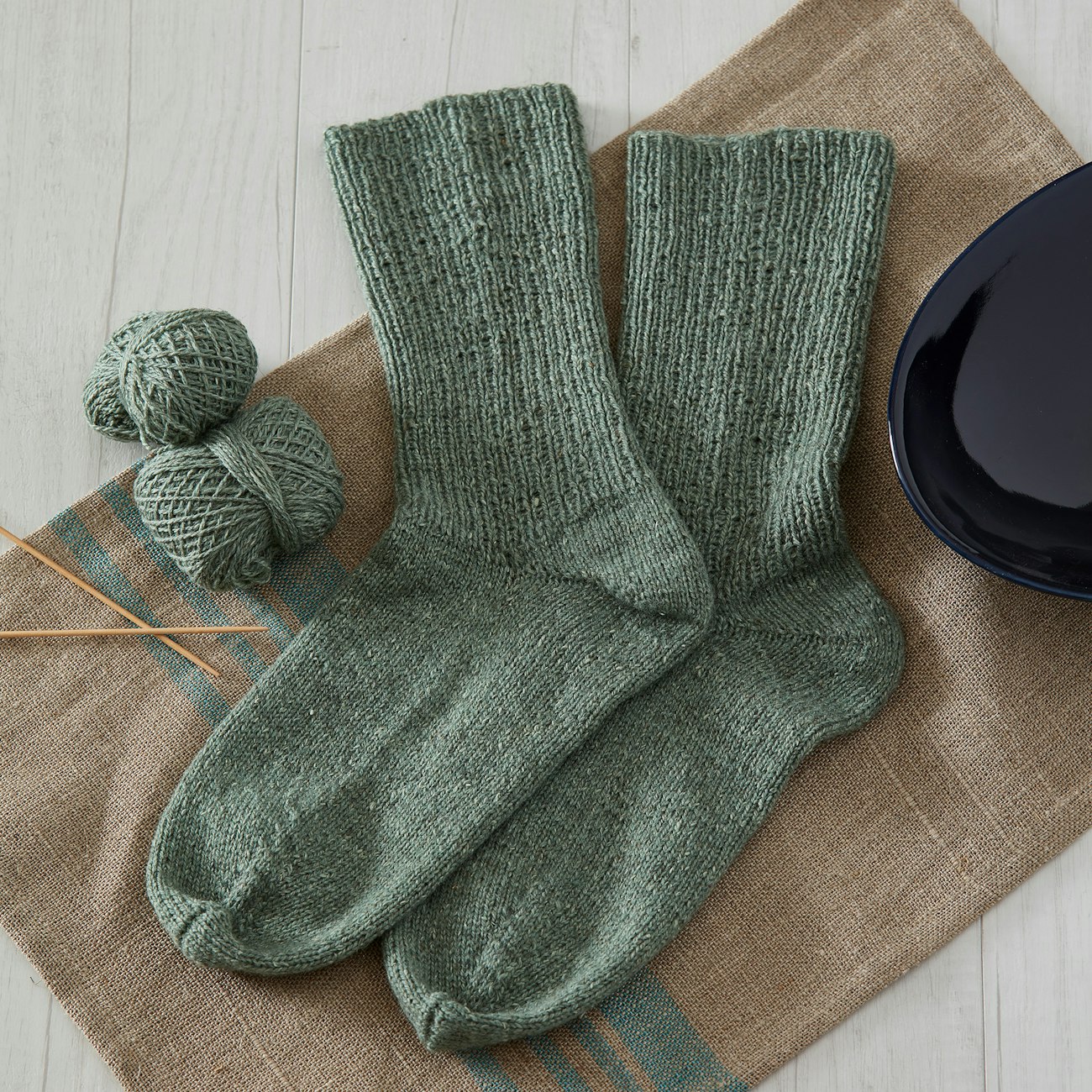 My version of Swedish raggsocks relies on a special yarn for combining luxury with practicality. I think of the yarn as Scandinavia meets the Silk Road. Blacker Yarns’ Samite contains Shetland and Gotland wools plus silk to provide strength and semilustrous Bluefaced Leicester wool to add softness and a subtle sheen. The Shetland also adds bounce and cushioning.