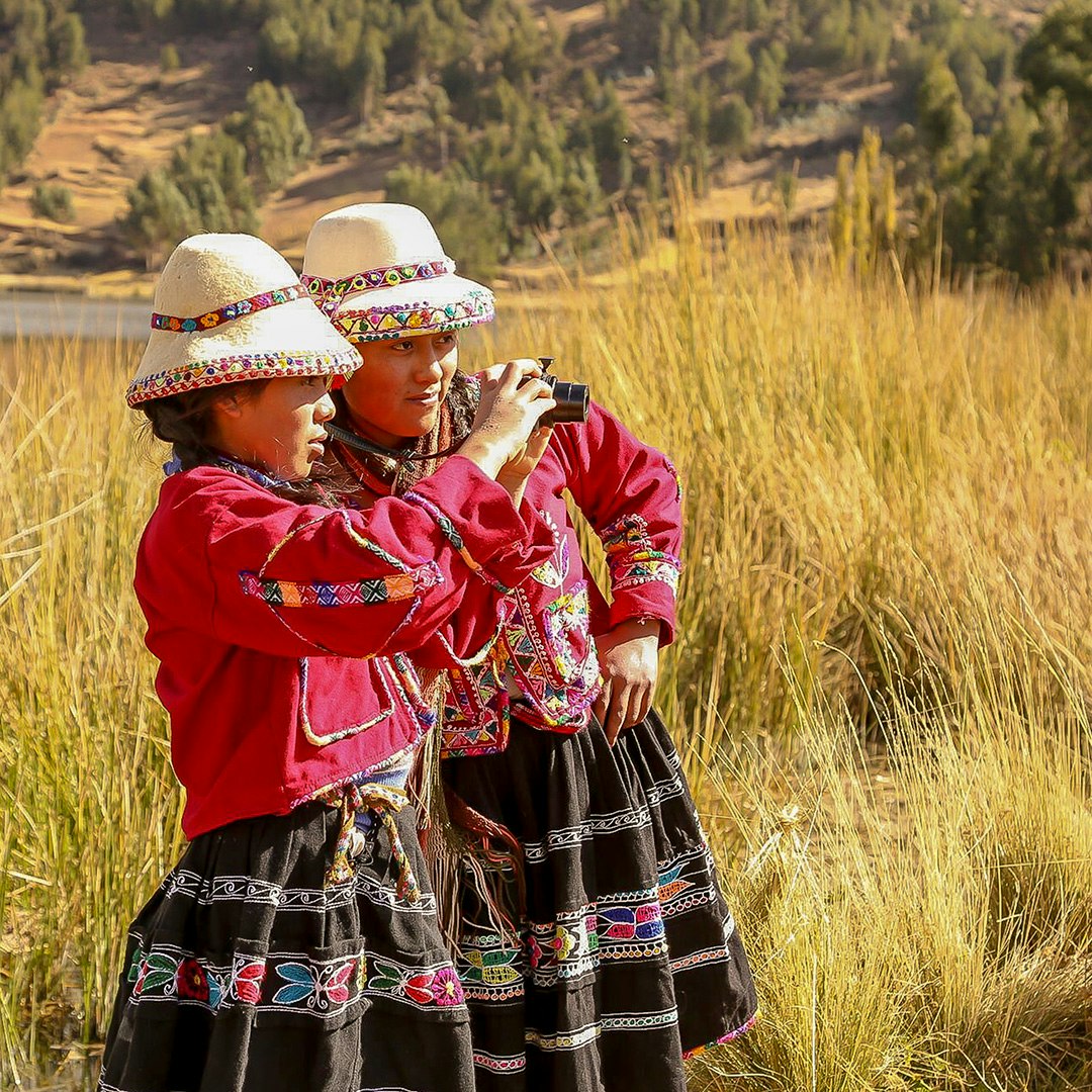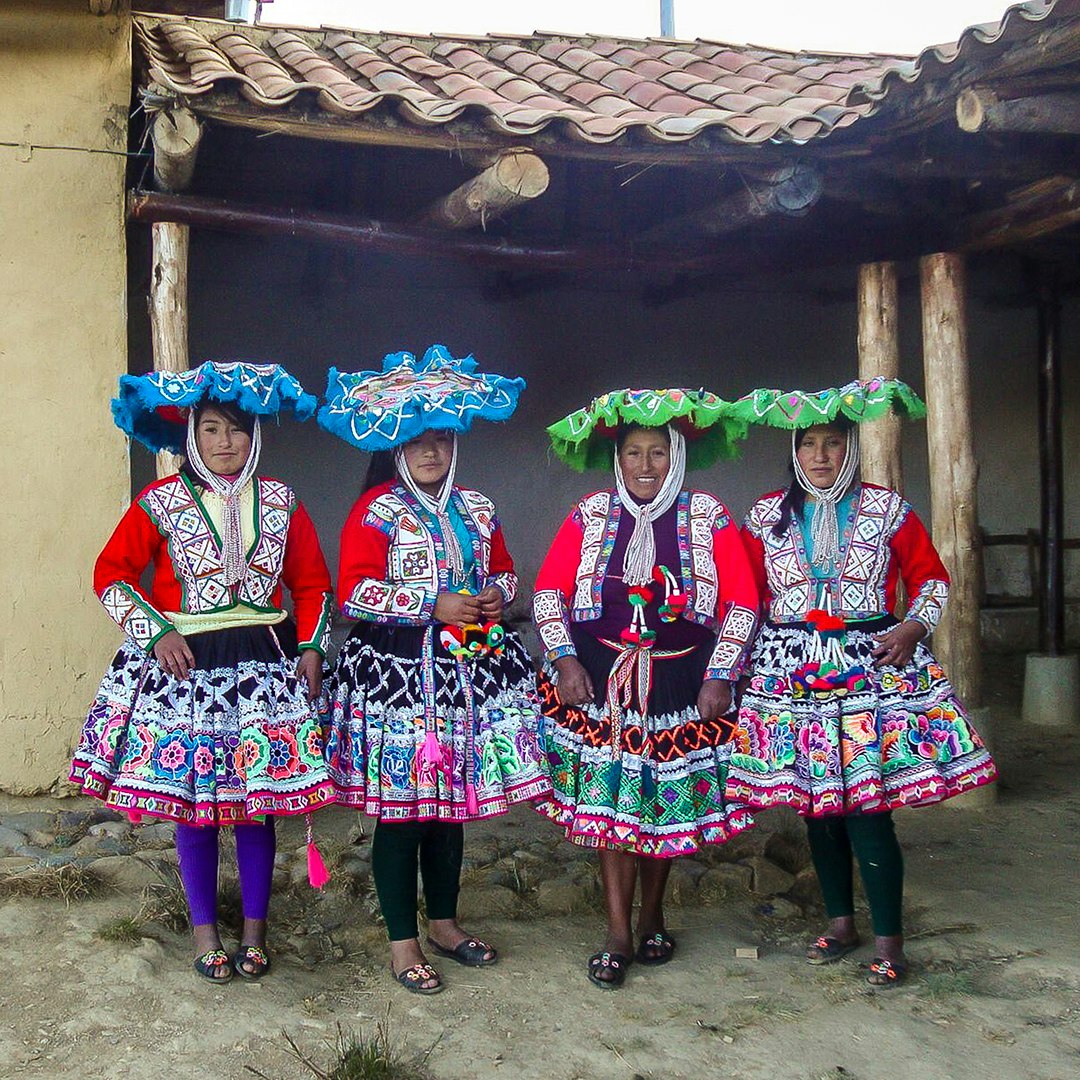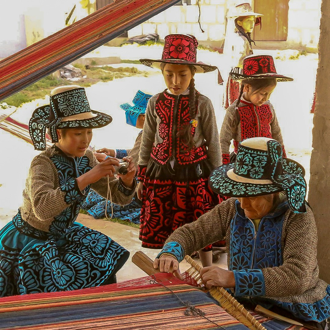 Girls from Santo Tomás, Chumbivilcas, interview an elder in their remote village. The traditional costume here is reverse appliqué rather than handwoven.