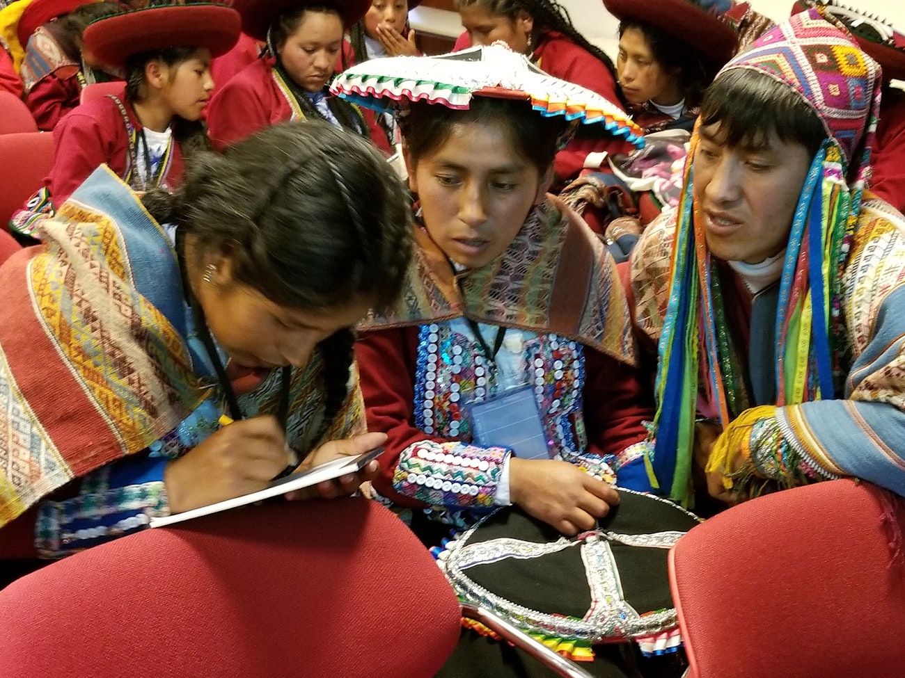 Children from Pitumarca work together crafting text for their book. They were attending Tinkuy 2017 in Cusco, a gathering of weavers of all ages from around the world. Photo by Marilyn Murphy