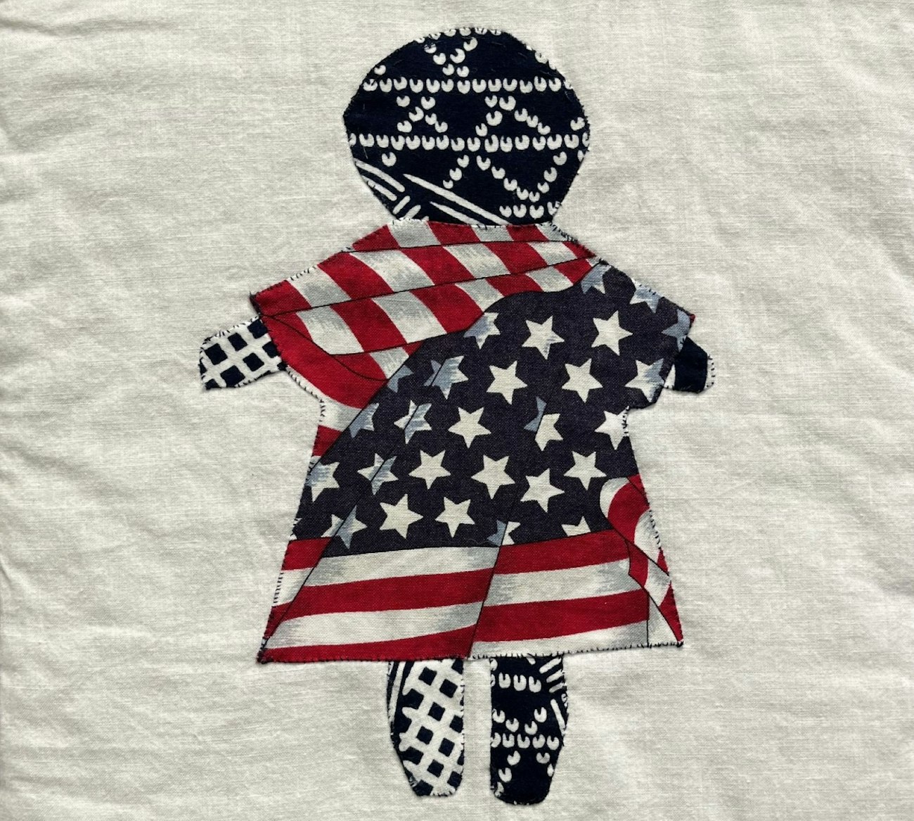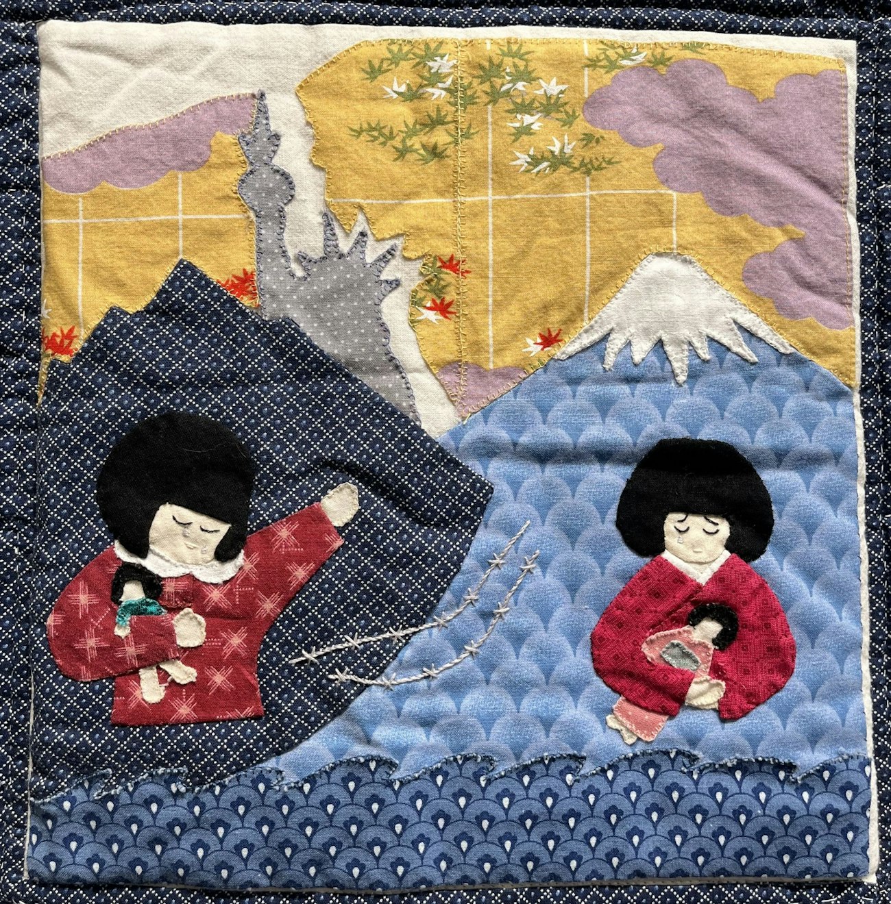 Rose Yoko Kubo Yamamoto reflects a similar idea as she describes her block: “The body of the doll on this quilt block is made from Japanese yukata material. The flag material is American. This block denotes that I am one of many who have Japanese features, who is of Japanese ancestry and culture, but have been born and assimilated into the American culture, which is made up of cultures of many countries which have united into one.”
