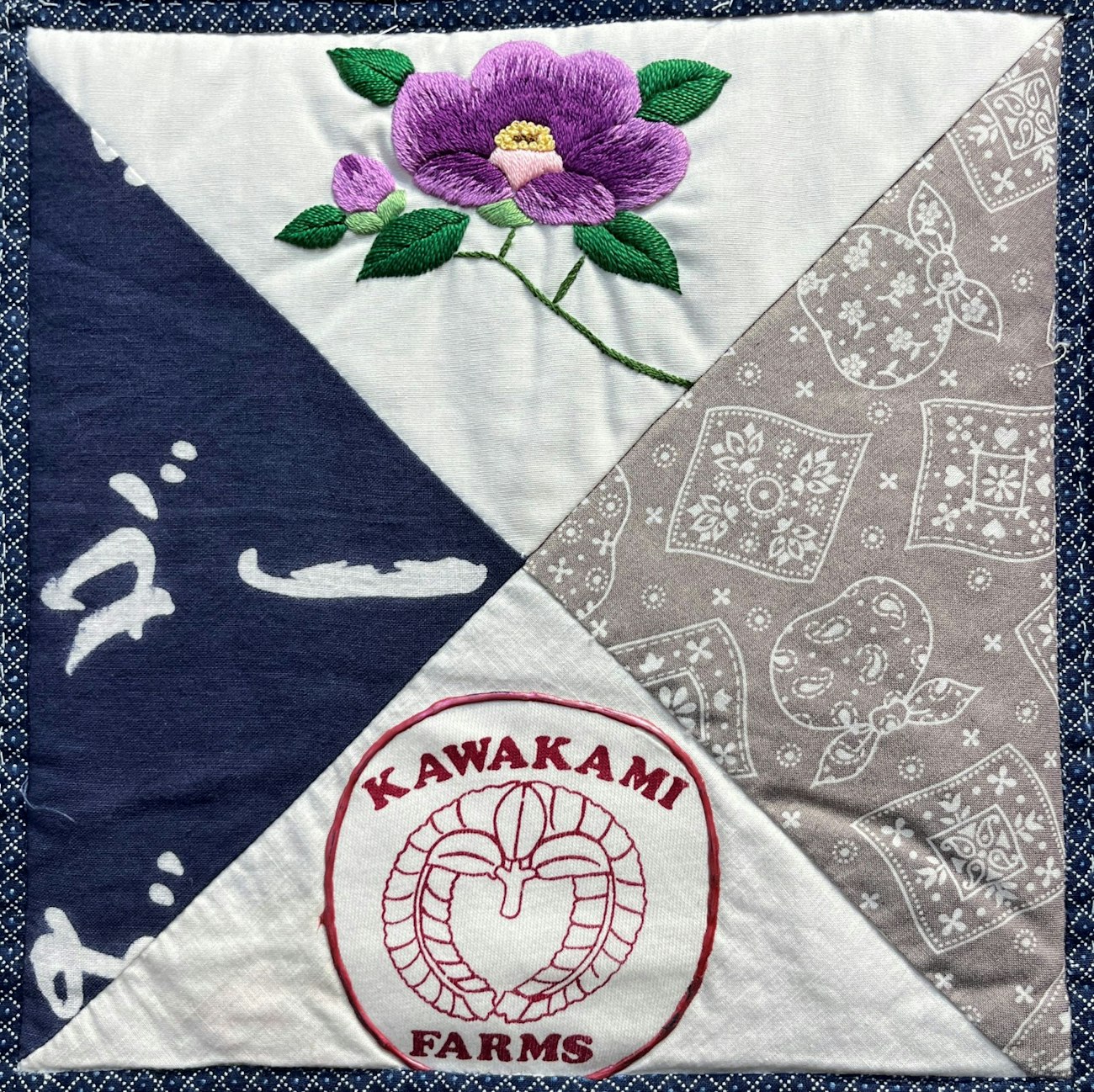The first triangle [bottom] represents the Kawakami homeland in Okayama-ken, Japan. This original fabric is made from a doorway banner that was given to our family by our Okayama relatives. The embroidery [top] was done by my late grandmother, Shikano Iritani. She did these projects during the long winter days on the family farm in Littleton, Colorado. She would create and embroider her beautiful designs to perfection. The blue handkerchief [right, faded to gray] triangle represents our Sansei (third) generation as to how Americanized we have all become. The fourth triangle [left] is the Kawakami kamon (family crest). We now have our block complete. We’ve learned American values and ways but yet have learned to appreciate our rich Japanese heritage and culture through the hard work and perseverance of our grandparents and parents.