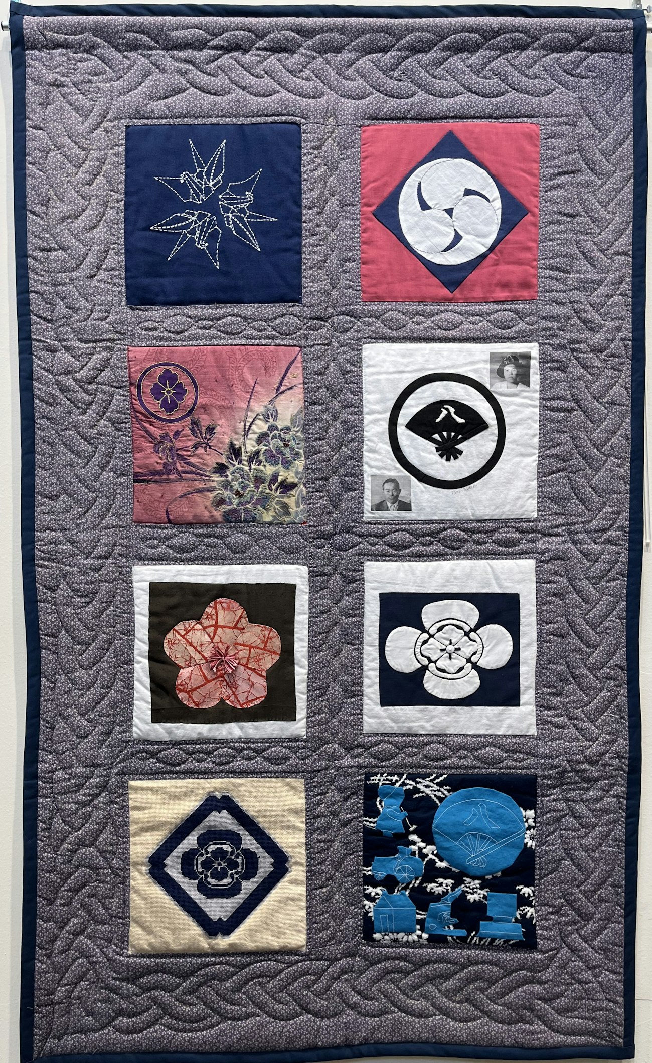 A Quilt Panel from the Japanese American Quilt Project. From top, left to right: Quilt blocks made by Pam Shinto; Janice Hikida Campbell; Teri Harada-Shoji; Susan Kiyoko Sagara; Kana Yorimoto, Chris Yorimoto Sagara, Susan Kiyoko Sagara; Nancy Tanaka Miyahara; Masa Nakamura Nishimura; Stacey Okubo Davis; Denisse Yamashita Allaire. All photos courtesy of the Rocky Mountain Quilt Museum