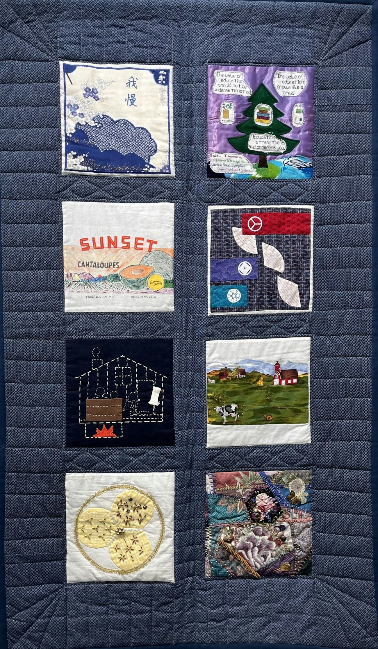Many of the quilt blocks have emblems, logos, and other remembrances of the farms and businesses often owned and operated by multiple generations of a family. Quilter Anna Kato Murahata explains the scene on her quilt block: “After a hard day of stoop labor on the farm, Mother enjoyed relaxing by sitting in the open doorway where the cool night breeze came through and would have one of us children pound her shoulders with our clenched fist. During this time she would reminisce and tell us stories of many things. She was prematurely grey and passed away before we were mature enough to make life easier for her.”