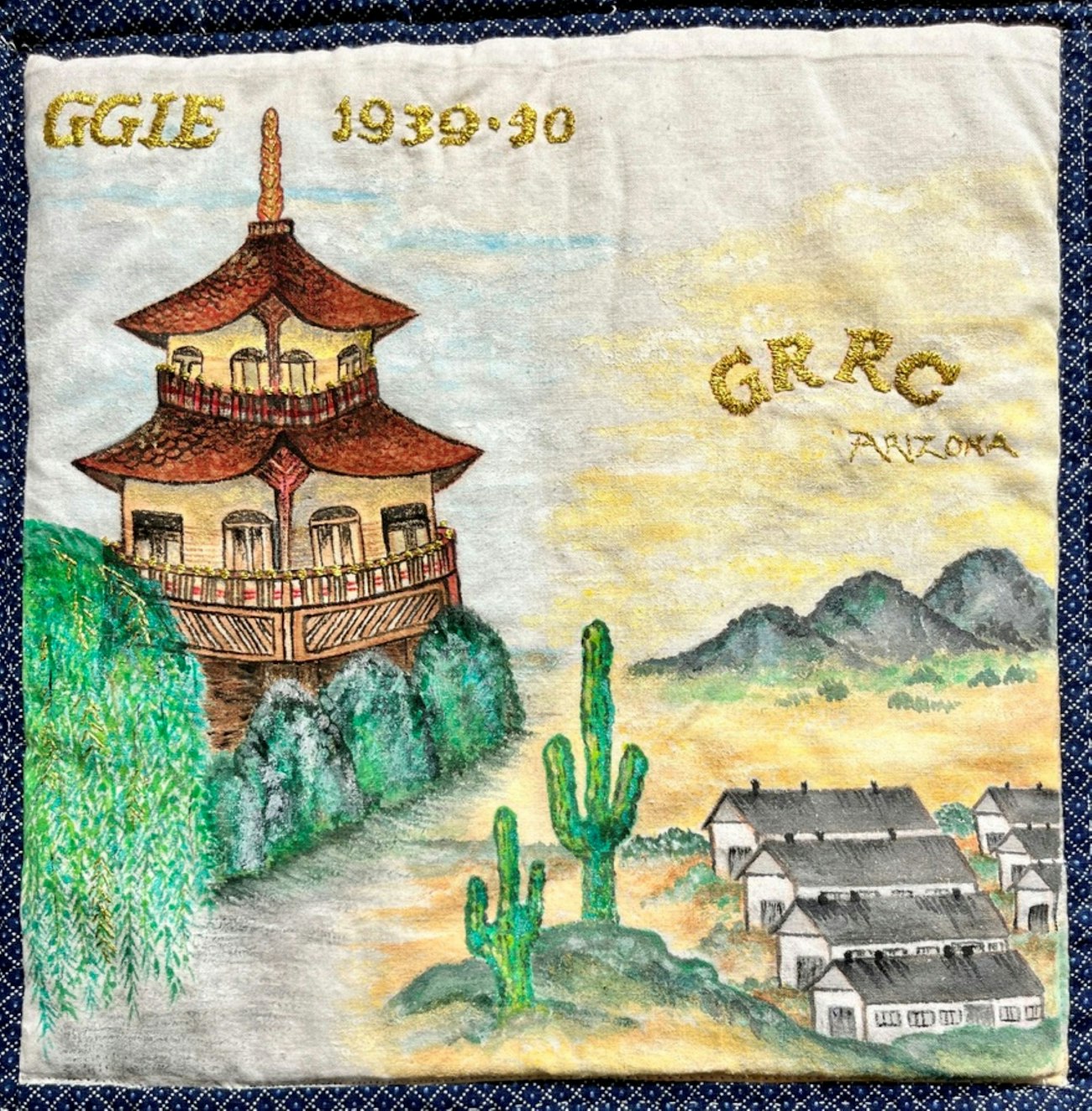 Torie Yamaguchi Ito's quilt block depicts the Japanese Pavilion (1939-1940) where she represented Japan during the Golden Gate International Exposition. The lower right depicts the Gila River Relocation Center in Arizona where her family was interned during World War II.