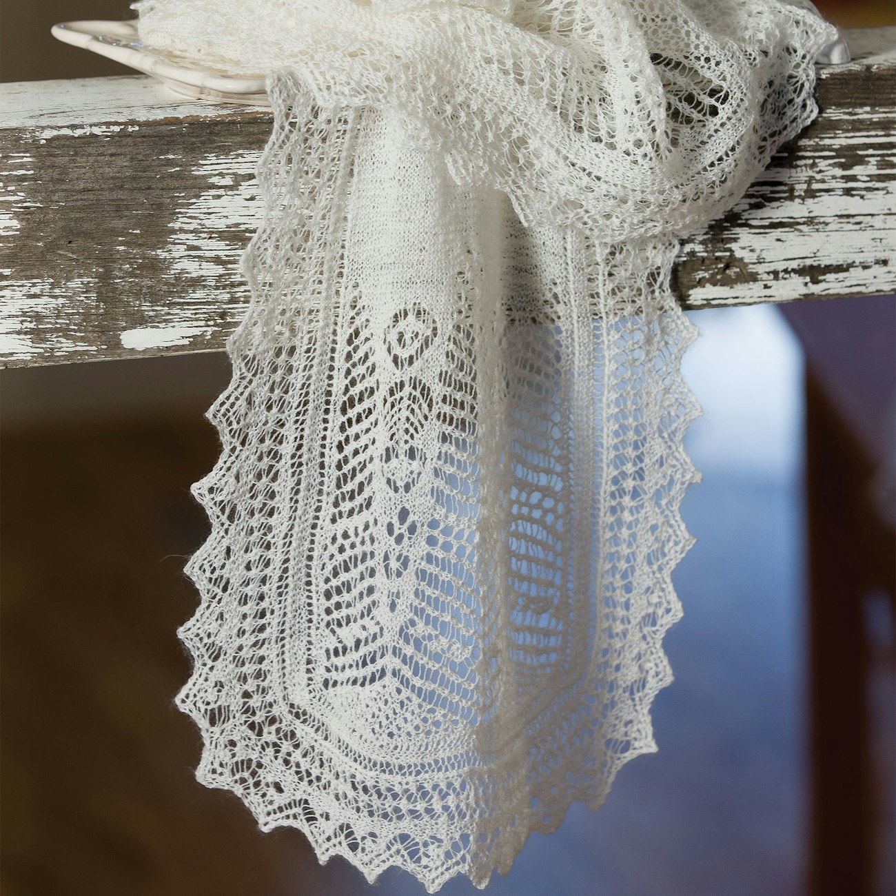 Margaret Stove’s elegant Shetland lace scarf was inspired by an original Shetland shawl knitted by Granny Cheyne after she immigrated to New Zealand.