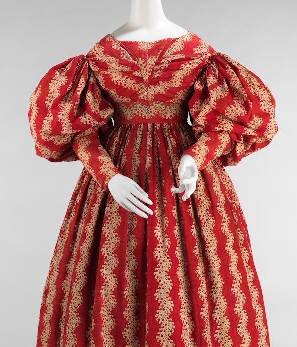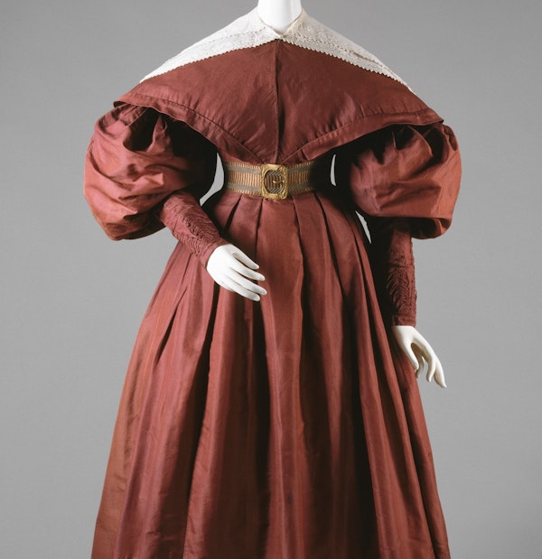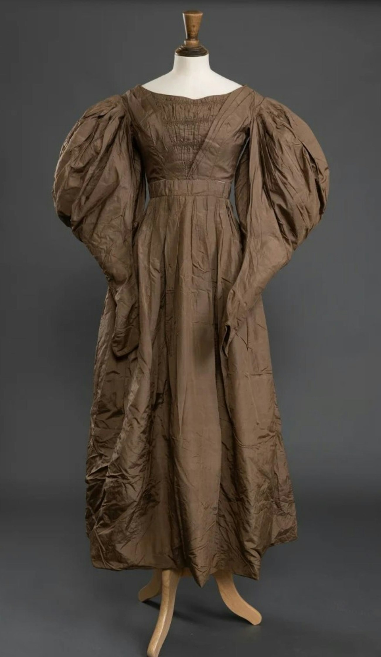 A brwon silk dress in the Cornwall Museum's collection features leg-of mutton sleeves. Cornwall, circa 1830s. Photo courtesy of Cornwall Museum. Visit the museum's website to see more photos and the history of the complete ensemble