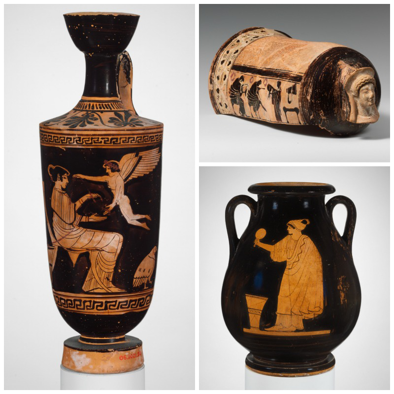 Left: On an oil jar made around 480–470 BCE, a woman greets Eros as she sits next to her wool basket. Photo courtesy of the Metropolitan Museum of Art, Rogers Fund, 1906. Lower right: A woman stands next to her wool basket as she looks at her reflection in a mirror, on jar from about 480–470 BCE. Photo courtesy of the Metropolitan Museum of Art, purchased by subscription, 1896. Upper right: A leg guard showing women preparing wool for spinning. Photo courtesy of the Metropolitan Museum of Art, Rogers Fund, 1910