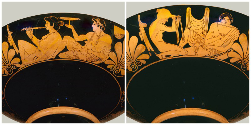 A drinking cup from around 500 BCE shows scenes from a symposium. At left, a flute girl plays before a reclining man. At right, she binds her hair next to the man, with her robes hanging in the background. Photo courtesy of the Metropolitan Museum of Art, Purchase, Amalia Lacroze de Fortabat Gift and The Bothmer Purchase Fund, 1993